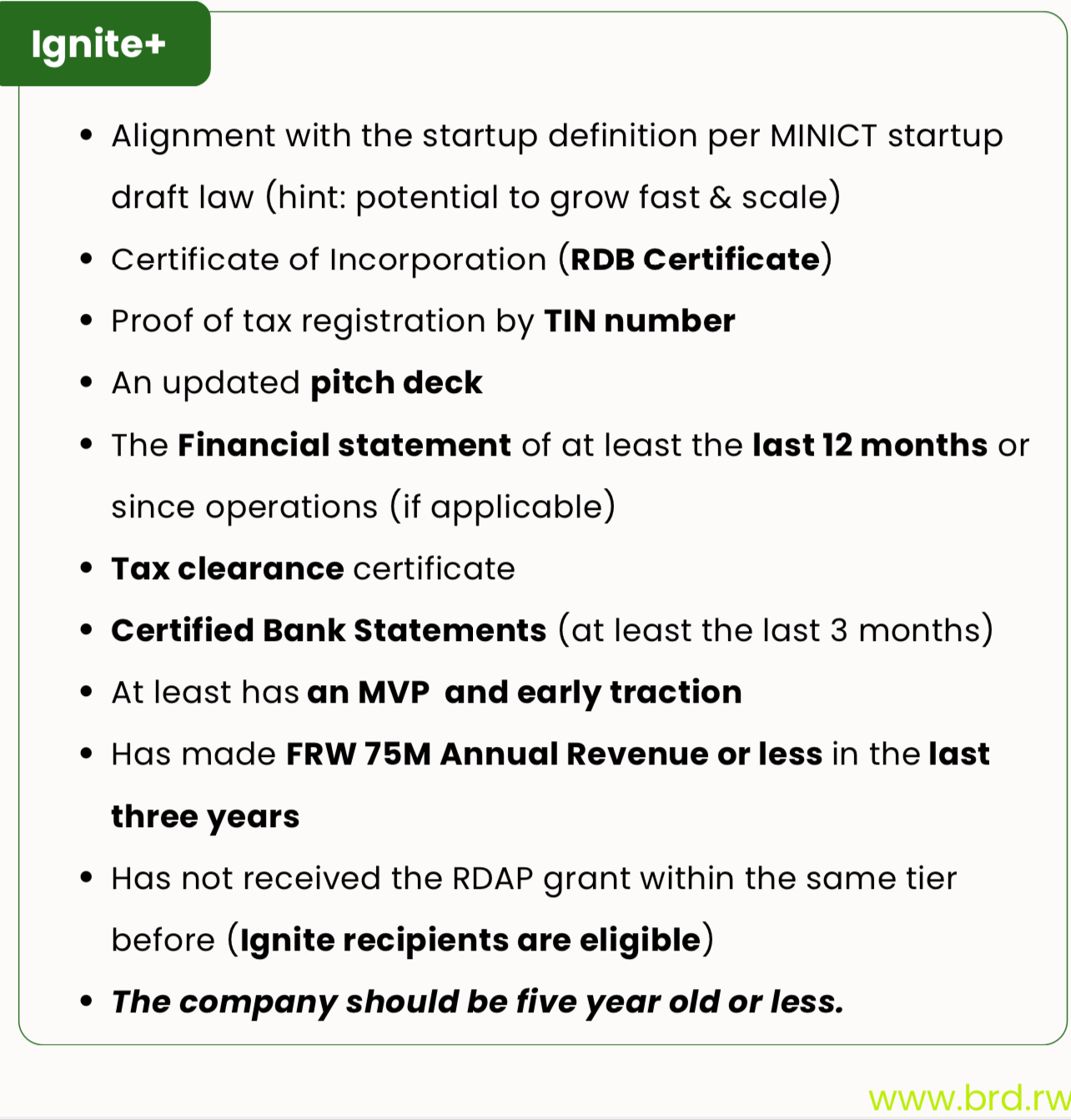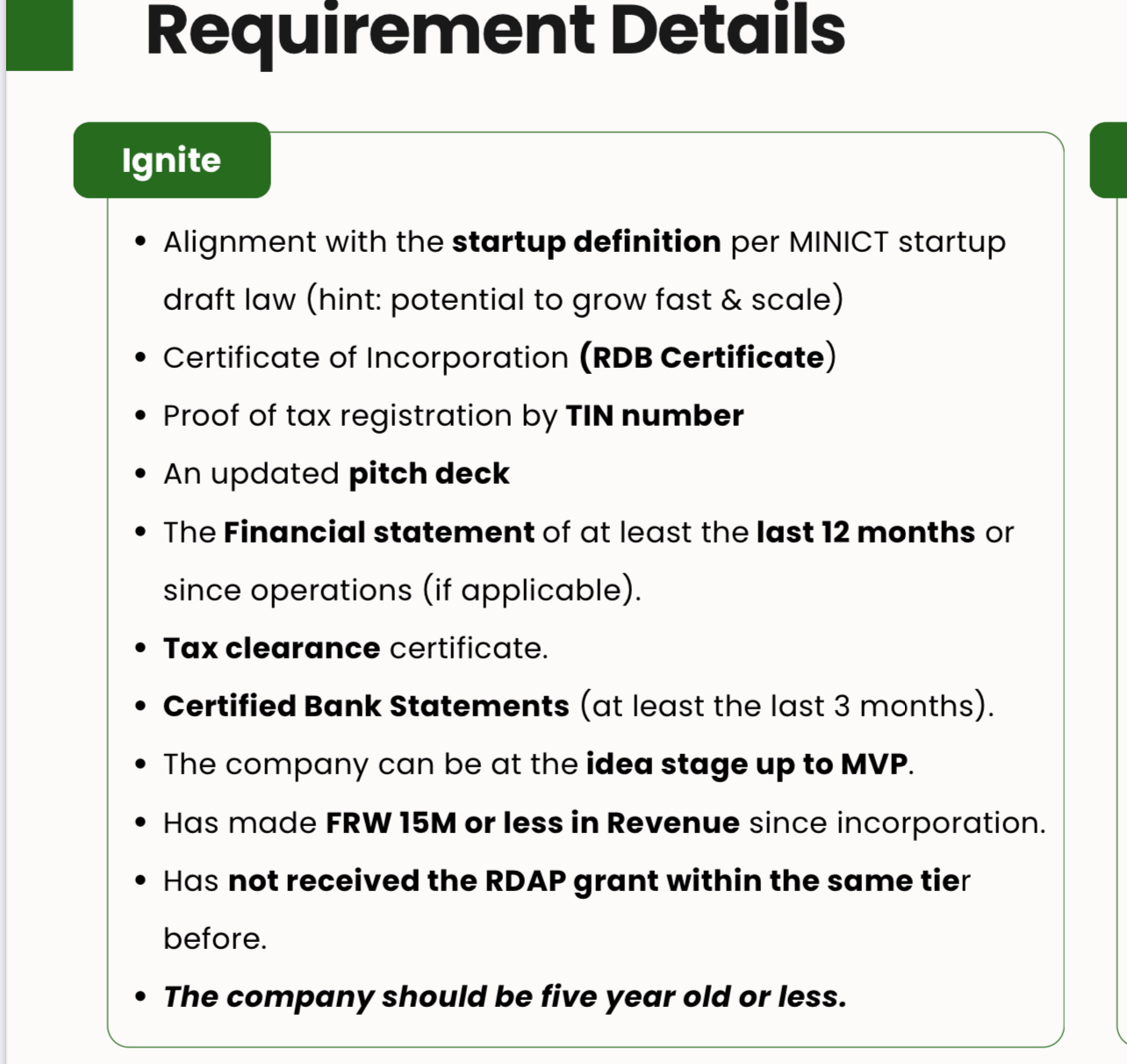 Applicants are required to present incorporation certificates from RDB, proof of tax registration through a TIN number, updated pitch decks, financial statements, certified bank statements covering at least three months, and a valid tax clearance certificate.