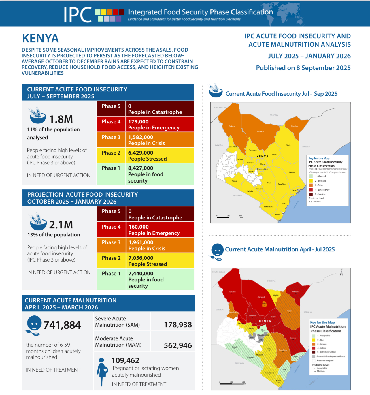 Kenya is facing a worsening food and nutrition crisis, with 2.1 million people projected to experience acute food insecurity between October 2025 and January 2026, according to the Integrated Food Security Phase Classification (IPC) Acute Food Insecurity and Acute Malnutrition Analysis for Kenya.