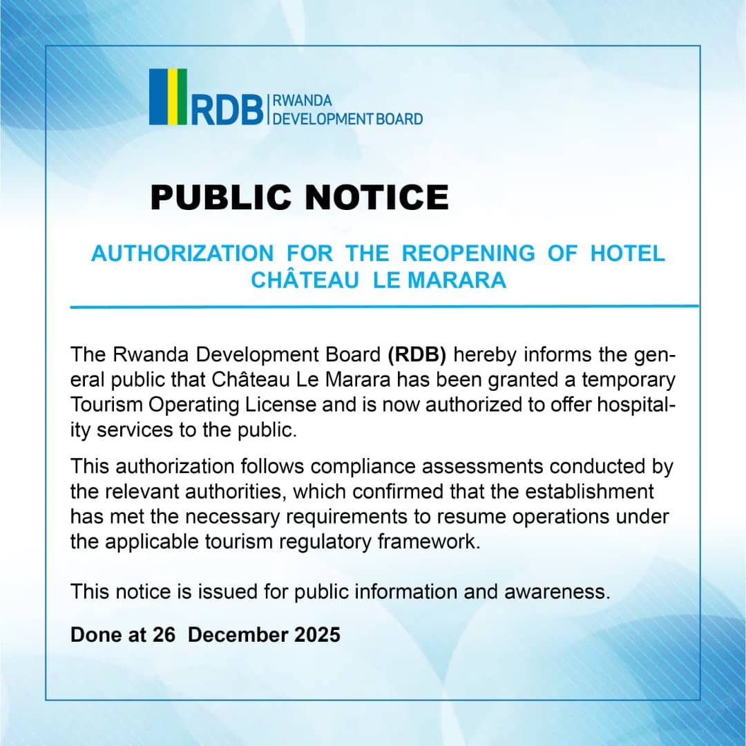 The facility comprises 21 rooms and 21 beds, with two food and beverage outlets offering international, African, and barbecue cuisine. The approval places the property among Rwanda’s formally regulated hospitality establishments as it prepares to scale operations.