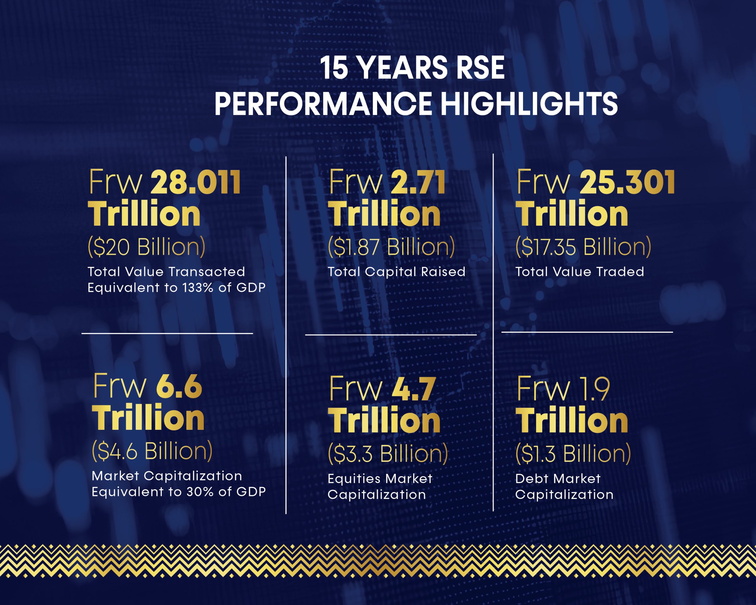 Market capitalisation today stands at approximately Frw 6.6 trillion, including Frw 4.7 trillion in equities and about Frw 1.9 trillion in debt securities. Since its establishment, the Exchange has facilitated capital raising of roughly Frw 2.71 trillion for businesses and public projects. Total market turnover has exceeded Frw 25.3 trillion, with more than Frw 28 trillion circulating through the market overall.