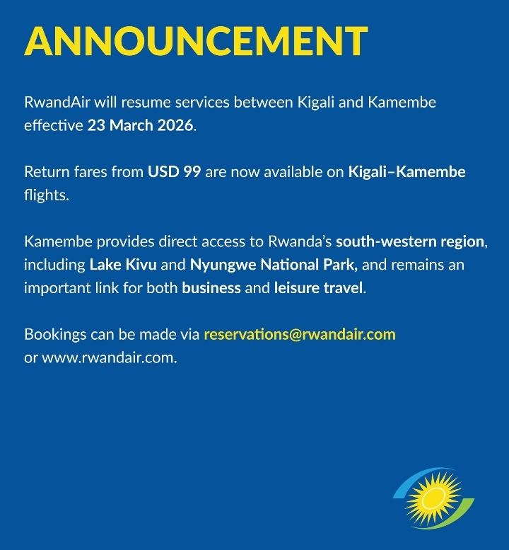 NationalRwandAir Resumes Flights From Kigali to Kamembe Last updated: March 17, 2026 5:56 pm By Bigabo 2 hours ago Share 0 Min Read SHARE Rwandair has announced resumption of flights between Kigali and Kamembe effective March 26th. Share This Article Whatsapp Whatsapp LinkedIn Telegram Threads Copy Link Leave a CommentLeave a Reply Cancel replyYour email address will not be published. Required fields are marked *Comment *Name * Email * Website Save my name, email, and website in this browser for the next time I comment. Stay Connected - Advertisement -Most Read AFC/M23 Rebels Surround Uvira City Cow-horn Style RwandAir Resumes Flights From Kigali to Kamembe Kigali Fight Night Signals Rwanda’s Rise as Africa’s Next Boxing Powerhouse Jamaica Praises Rwanda For Post Disaster Support Stay Connected1.3MSubscribersSubscribe3.5MFollowersFollow4.9MFollowersFollow45KFollowersFollow- Advertisement -
