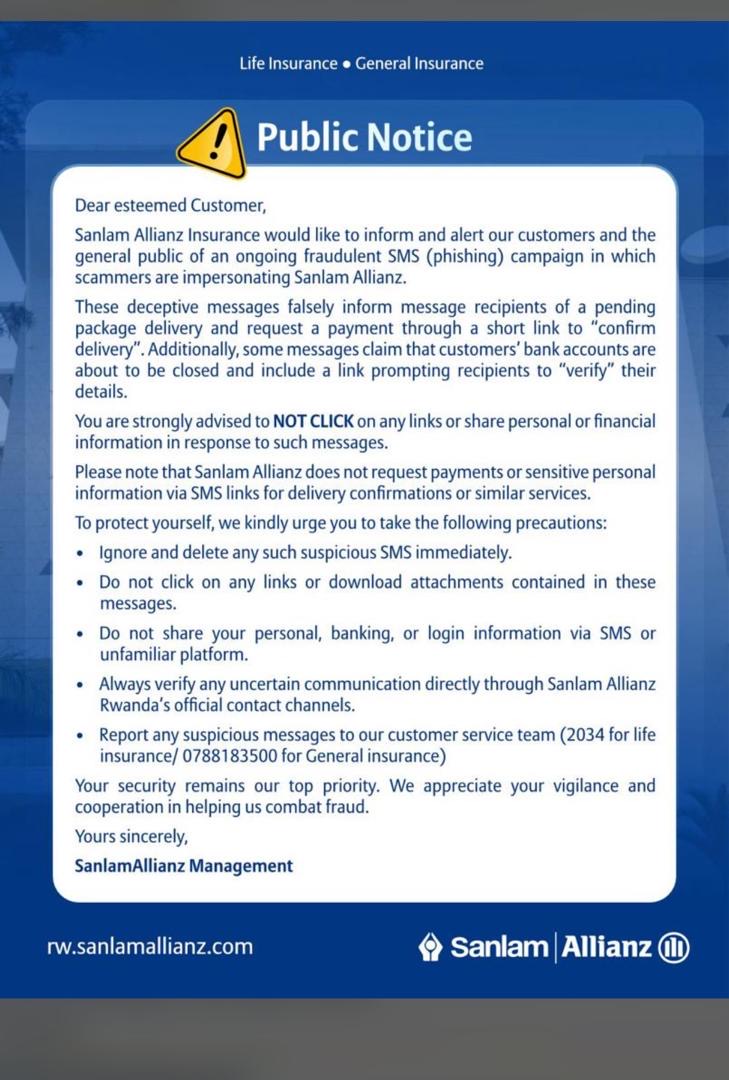 Sanlam Allianz Rwanda has issued a public warning over an ongoing fraudulent SMS campaign targeting its customers, amid growing concern over coordinated scam attempts in the country’s financial sector.