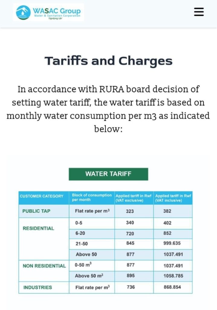In an official public notice released on April 17, 2026, WASAC clarified that the current water pricing structure, approved by the Rwanda Utilities Regulatory Authority (RURA) and in effect since February 1, 2019, has not been modified.
